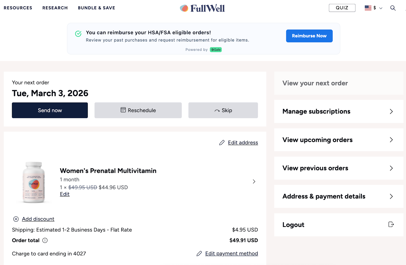 Easy! Simply log in to your subscription portal and you’ll see a banner at the top of your dashboard for sign up. Click the “reimburse now” button to connect your HSA/FSA card.