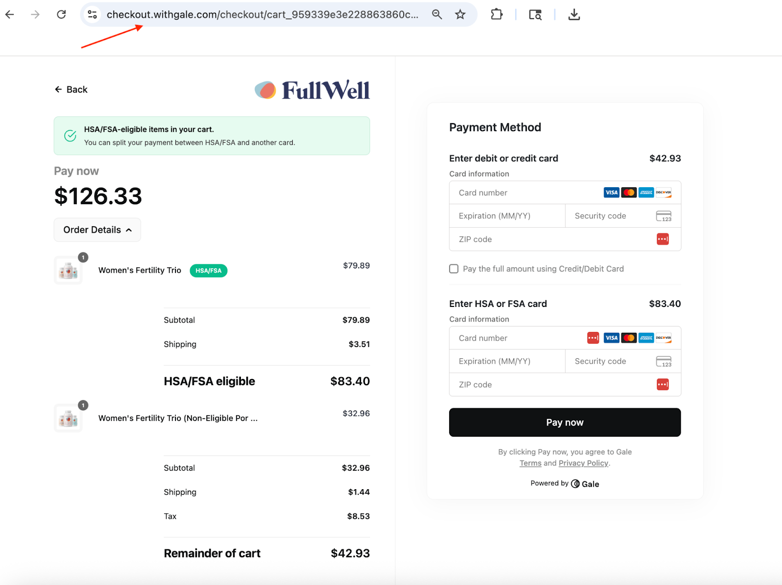 If you’re making a 1-time purchase, you’ll be redirected to a split payment screen and prompted to pay with your HSA/FSA card for the eligible items and pay the difference with your credit card.