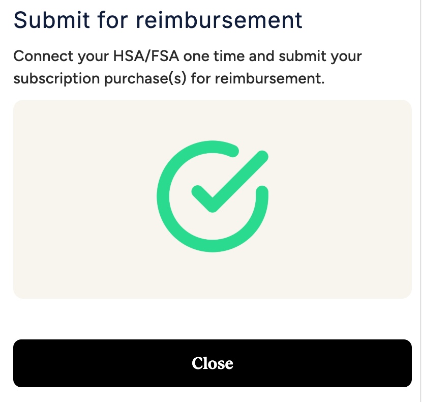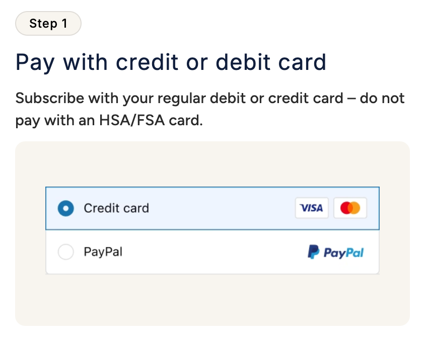 If you’re purchasing a subscription, you’ll use your regular credit or debit card at checkout - do not pay with your HSA/FSA card. After your purchase, connect your HSA/FSA via the confirmation page or subscription portal. Once connected, all future recurring purchased of eligible products will be auto-reimbursed.